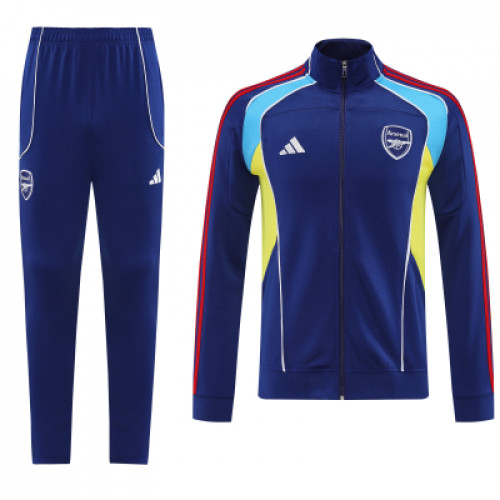 Спортивный костюм Arsenal (сезон 25/26): олимпийка на полной молнии и зауженные брюки в тёмно-синем цвете. Контрастные вставки голубого и жёлтого, красные акценты на рукавах и тонкая окантовка подчёркивают ретро-динамику. Эмблема клуба и логотип adidas завершают образ — удобно для тренировок и повседневной носки.