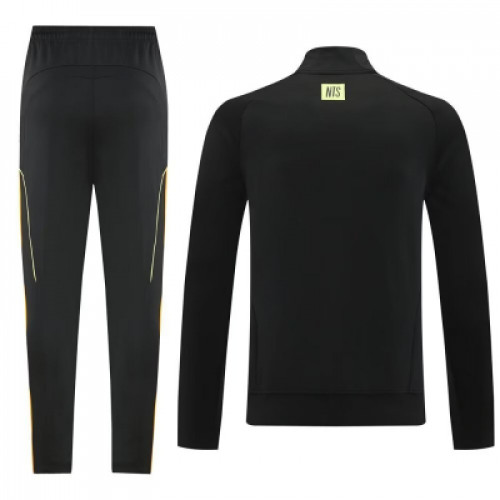 Спортивный костюм «Арсенала» сезона 2025/2026 в черном цвете выполнен из легких, функциональных материалов и имеет современный дизайн с контрастными деталями. Описание дизайна Основной цвет- черный, который является частью тренировочной коллекции клуба на этот сезон. Контрастные элементы: Детали и логотипы выполнены в желтом цвете, что создает яркий контраст с основным цветом. Сюда входят клубный герб «Арсенала», логотип производителя и спонсорские надписи. Стиль: Костюм отличается профессиональной и единой эстетикой. Есть яркие вставки и полоски на плечах и боковых панелях, как характерные черты дизайна тренировочной одежды.