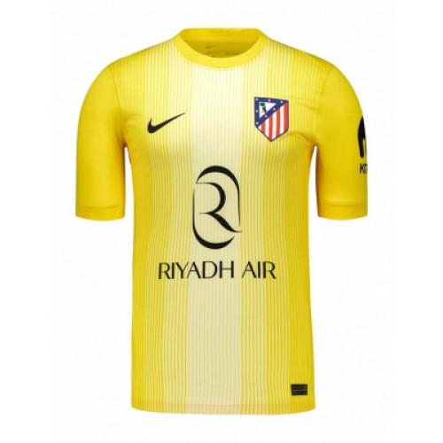 Вратарская форма «Атлетико Мадрид» сезона 2025/26 от Nike выполнена в ярком жёлтом цвете с плавным градиентом и тонкими вертикальными линиями, создающими эффект динамики и энергии. На груди размещены логотип клуба и спонсора Riyadh Air, а также фирменный знак Nike. Материал с технологией Dri-FIT обеспечивает превосходную вентиляцию и отвод влаги, помогая вратарю сохранять комфорт и концентрацию на протяжении всего матча.