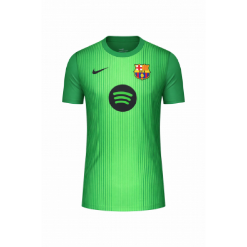 Вратарская футболка FC Barcelona сезон 2025/26 в ярко-зелёном цвете с вертикальной графикой и лёгким градиентом. Чёрный Swoosh Nike на груди, клубный шеврон Barça и круглый спонсорский логотип Spotify по центру. Классический круглый ворот и короткий рукав — заметный, “матчевый” образ для игры и коллекции.