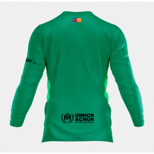 Вратарская форма «Барселоны» сезона 2025/26 от Nike выполнена в насыщенном зелёном цвете с тонкими вертикальными линиями, создающими динамичный визуальный эффект. На груди расположен контрастный логотип Spotify и эмблема клуба, подчёркивающие современный стиль дизайна. Длинные рукава обеспечивают дополнительный комфорт и защиту, а ткань с технологией Dri-FIT ADV эффективно отводит влагу и сохраняет ощущение свежести на протяжении всего матча.
