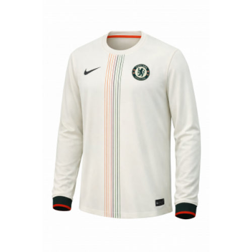 Гостевая джерси Chelsea сезона 2025/26 с длинным рукавом - светло-бежевая модель с яркой вертикальной полосой в оранжево-зелёной гамме, которая сразу делает образ необычным и заметным. Вживую и на фото смотрится свежо и современно: спокойная база плюс один сильный акцент по центру. Контрастные манжеты с цветной окантовкой добавляют деталей, но без перегруза. Отличный вариант, если хочется светлую гостевую форму нового сезона, которая выделяется и при этом остаётся стильной и аккуратной.