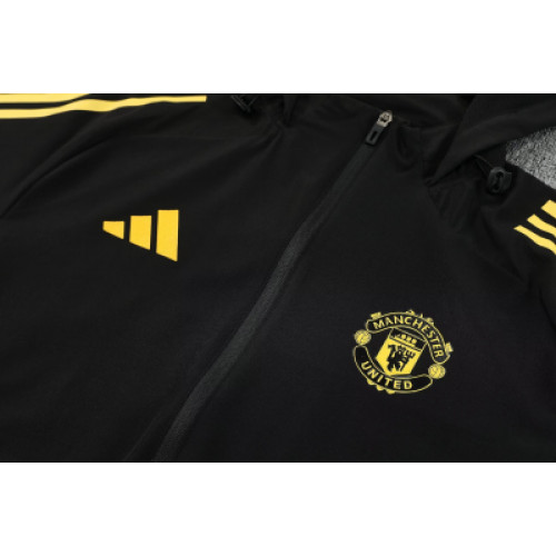 Черный спортивный костюм Manchester United для активных болельщиков. Куртка‑ветровка с капюшоном, желтыми полосками на плечах и эмблемой клуба на груди подчеркивает стиль. Зауженные штаны с эластичным поясом и синими вставками обеспечивают свободу движений. Легкий материал подходит для футбольных тренировок, пробежек и повседневной носки.