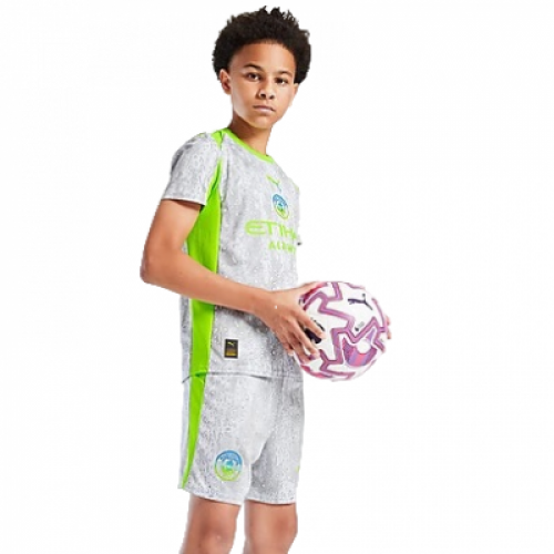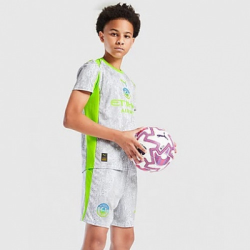 Новая третья форма «Манчестер Сити» 2025-2026 выполнена в сером цвете с ярко-салатовыми вставками и принтом в виде капель. Дизайн формы вдохновлен манчестерскими дождями. Основные характеристики формы: Дизайн: Современный серо-зеленый оттенок с контрастными вставками, обеспечивающими выразительный вид. Комплектация: Футболка с коротким рукавом, шорты Материал: 100% полиэстер с технологией влагоотвода и вентиляции. Детали: На груди расположены эмблема клуба и логотип производителя. Предусмотрена возможность индивидуального нанесения имени и номера