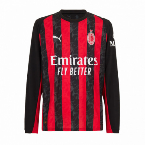 Домашняя джерси AC Milan сезона 2025/26 с длинным рукавом: классические красно-чёрные вертикальные полосы на фоне с тонким узором, белые логотипы PUMA и спонсора Emirates Fly Better. На груди — клубный герб с одной звездой, по бокам вставки для посадки по фигуре. Узнаваемая классика «россонери» для матча и повседневного стиля.