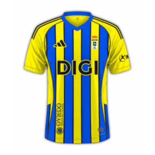 Гостевая форма «Реал Овьедо» сезона 2025/26 от adidas выполнена в ярком сочетании жёлтого и синего цветов — дань флагу Астурии и историческим корням клуба. Вертикальные полосы придают дизайну динамику, а чёрные акценты на воротнике, логотипах и номерах подчёркивают контраст и мощь стиля. На груди — эмблема клуба и логотип DIGI, ниже — надпись Oviedo, Origen del Camino, символизирующая происхождение и путь. Материал AEROREADY обеспечивает вентиляцию и комфорт даже в интенсивных матчах.
